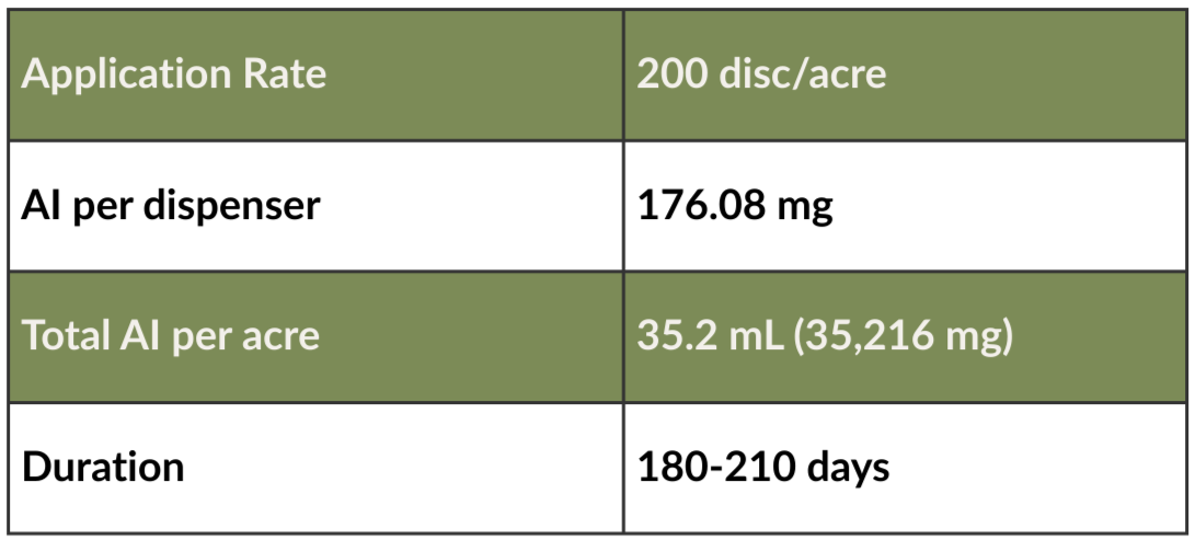 one application. The high rate of application is 200 dispensers per acre, with each dispenser containing roughly 347 milligrams of sex pheromone. That's roughly 5 tablespoons protecting an entire acre for 150 days.