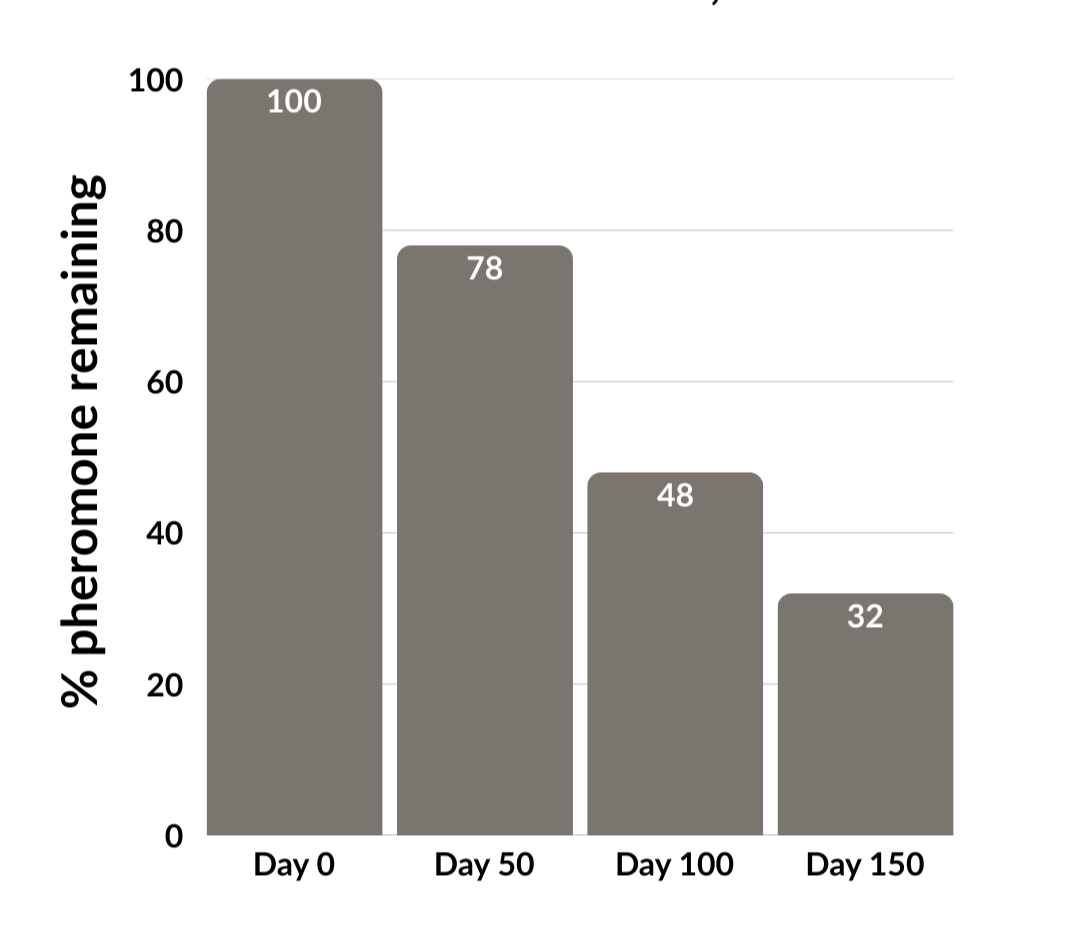 One application maintains consistent release rates for 180 days. For use in Apple, Pear, Quince, Walnut, Pecan, Peach, Prune, Plum, Nectarine, and other crops where Codling Moth is a pest.